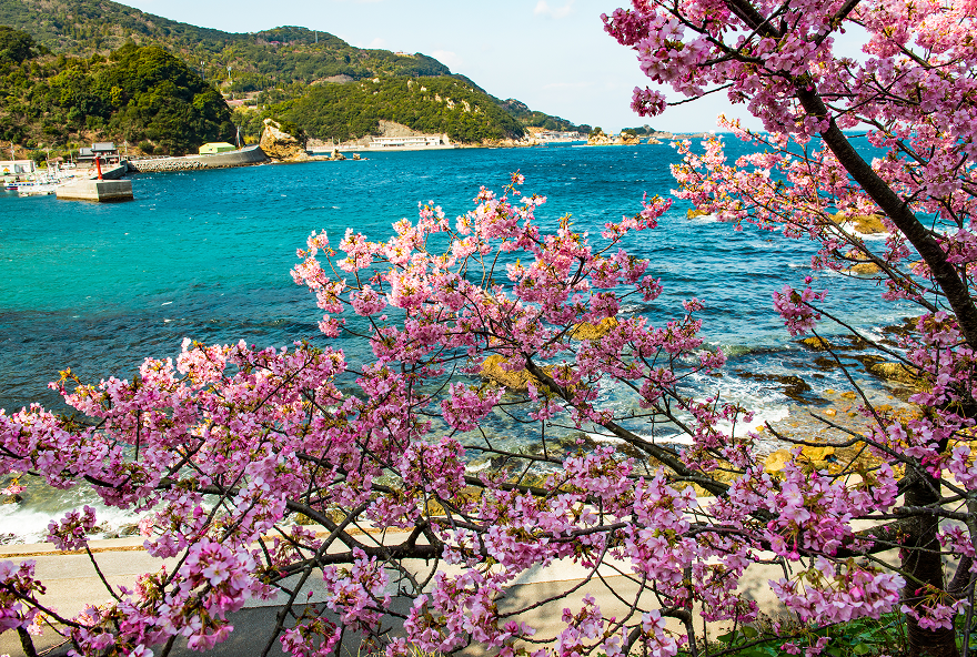 半島の海岸沿いに約4600本以上の河津桜が咲き誇り、青い海と濃いピンクの桜のトンネルをドライブできます。
