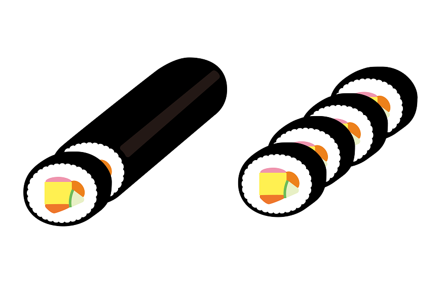 恵方巻には、キュウリ、シイタケ、桜でんぶ、卵焼きなど、色とりどりの具材が使われますが、これらは「七福神(7人の福の神)」に見立てて7種類入れるのが理想とされています。「福を巻き込んで食べる」という縁起の良いお寿司なのです。